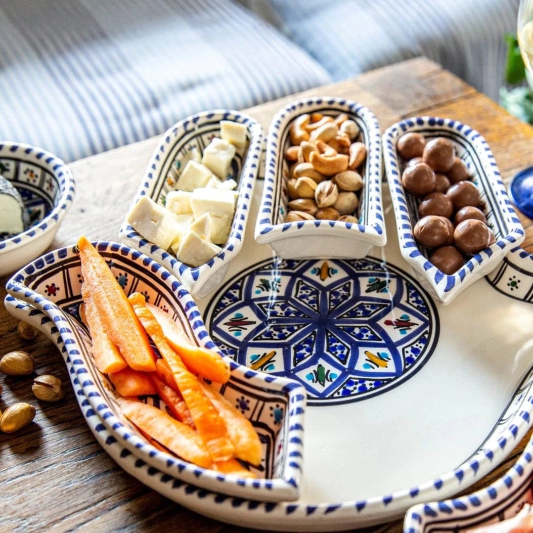 Elevate your gatherings with the Bohemian Blue Hamsa Serving Set, a stunning and versatile handmade ceramic piece inspired by the traditional Hamsa symbol. This unique set features six intricately designed trays that form the fingers and palm of the Hamsa hand, all resting on a large plate beneath. Perfect for serving appetizers, condiments, nuts, salsa, or chips, this set adds a touch of elegance and cultural flair to any occasion. Additionally, it can be used to hold jewelry or other small valuable charms, making it as functional as it is beautiful. This Hamsa serving set is a thoughtful and unique gift, ideal for wedding anniversaries, bridal showers, birthdays, housewarmings, or any special occasion.