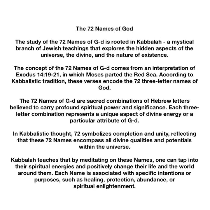 - Consists of 72 three-letter combinations representing divine energy and attributes.