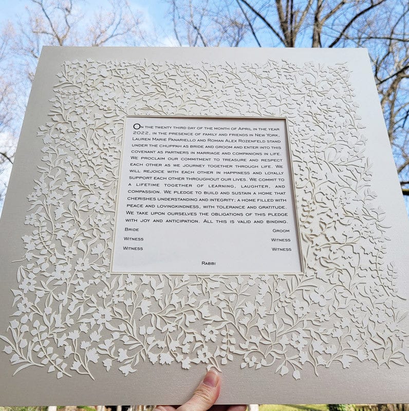 This remarkable papercut design is a delicate piece of lace made of blooming flowery sprigs. It frames your ketubah text handsomely.
