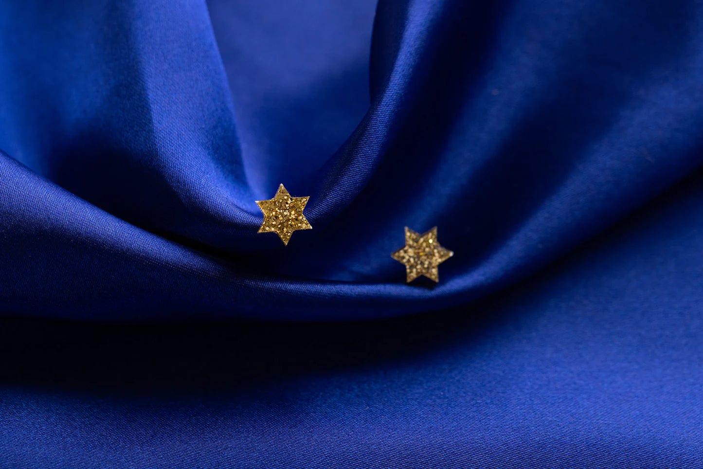 Add a touch of sparkle to any outfit with these Mini Magen David Earrings in Light Gold Glitter. Not only do they make a statement, but they also showcase your unique style and love for all things fun and glamorous. Perfect for any occasion!