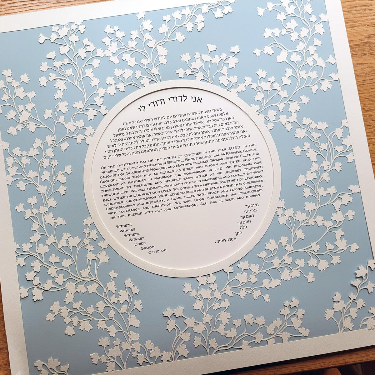 Once you have placed your order and sent in your Ketubah Worksheet, we will send you proof of your text so that you and your officiant can confirm that it is just right. At this point please let us know of any changes you would like to make to the text or formatting.