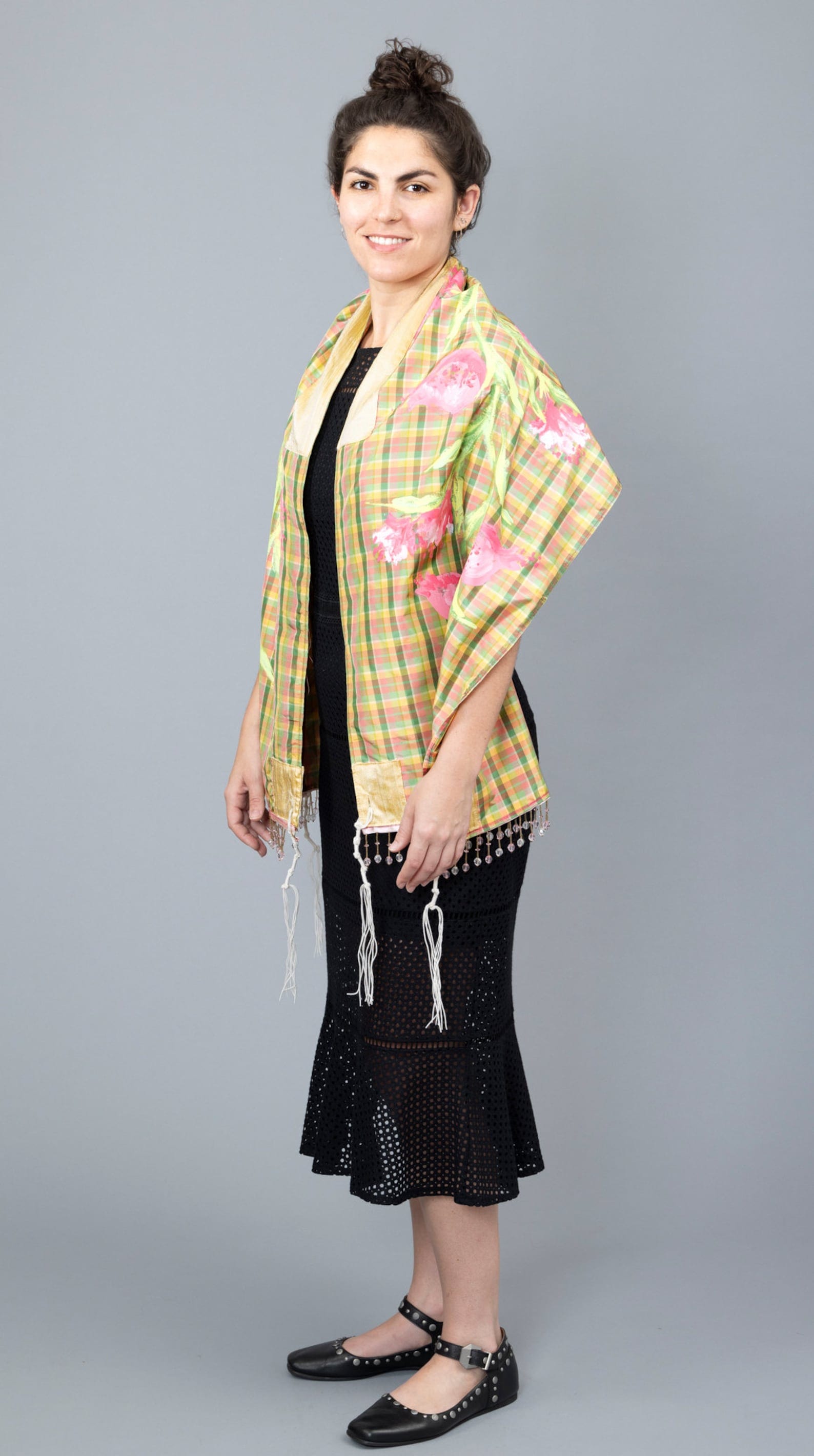 Add a splash of color with the Pink, Green, and Yellow Silk Plaid Tallit. Hand-painted pomegranates bring a festive feel, ideal for joyous occasions.