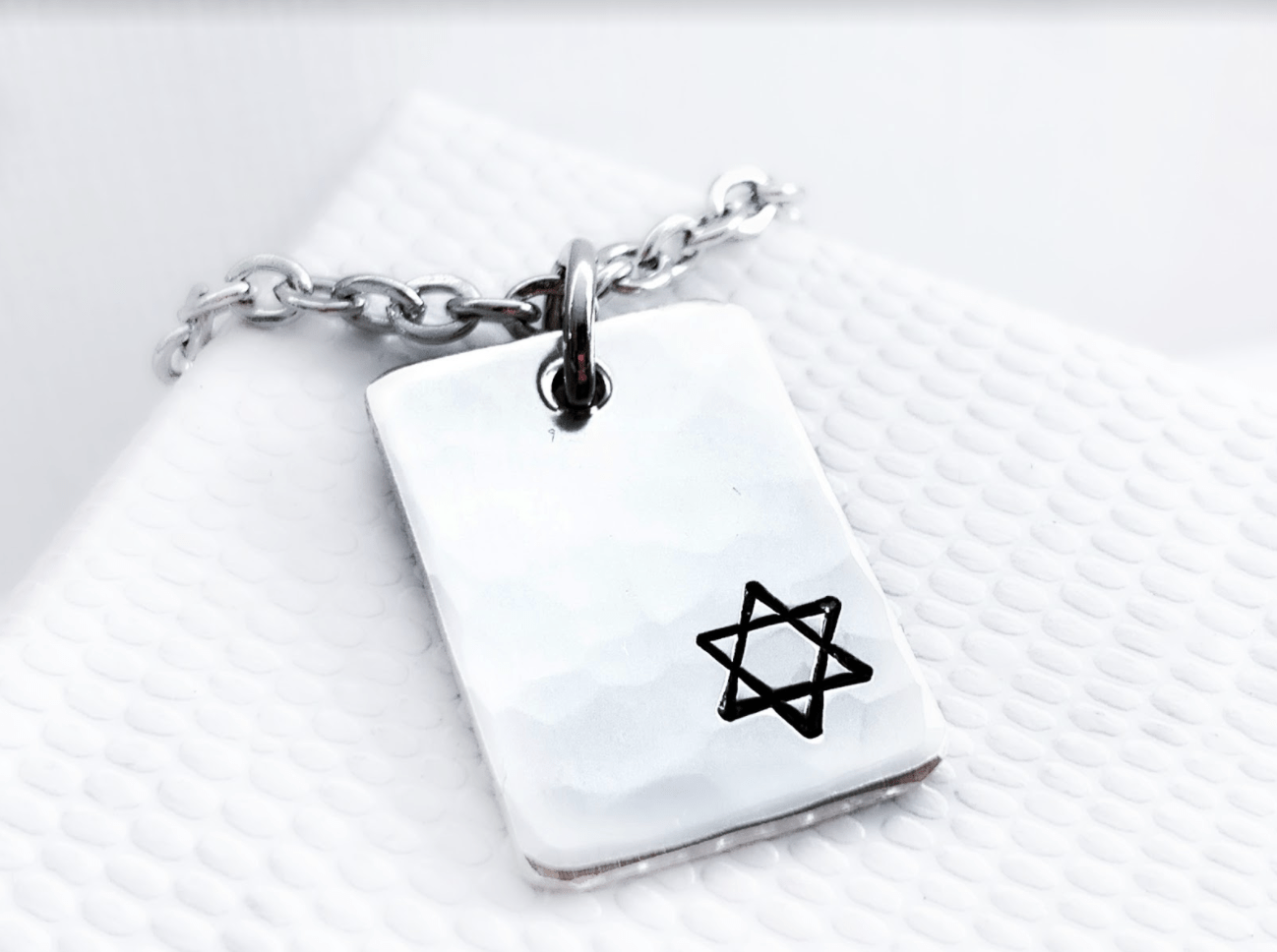 Small Star of David Hammered Rectangle Necklace features a�textured, lightly hammered sterling silver pendant.�It is hand-stamped with a�Star of David. This necklace is great for men and women.