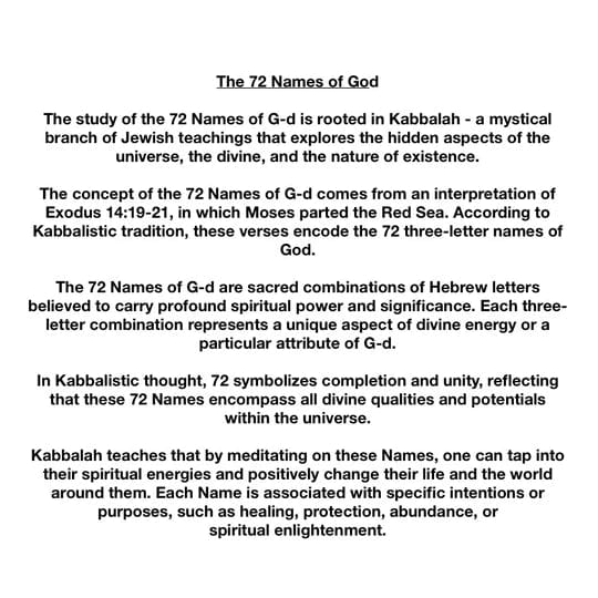 - Consists of 72 three-letter combinations representing divine energy and attributes.