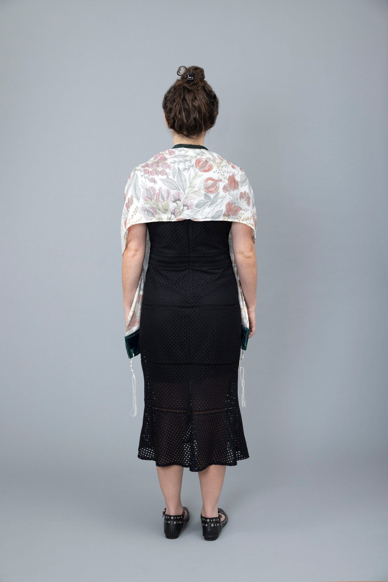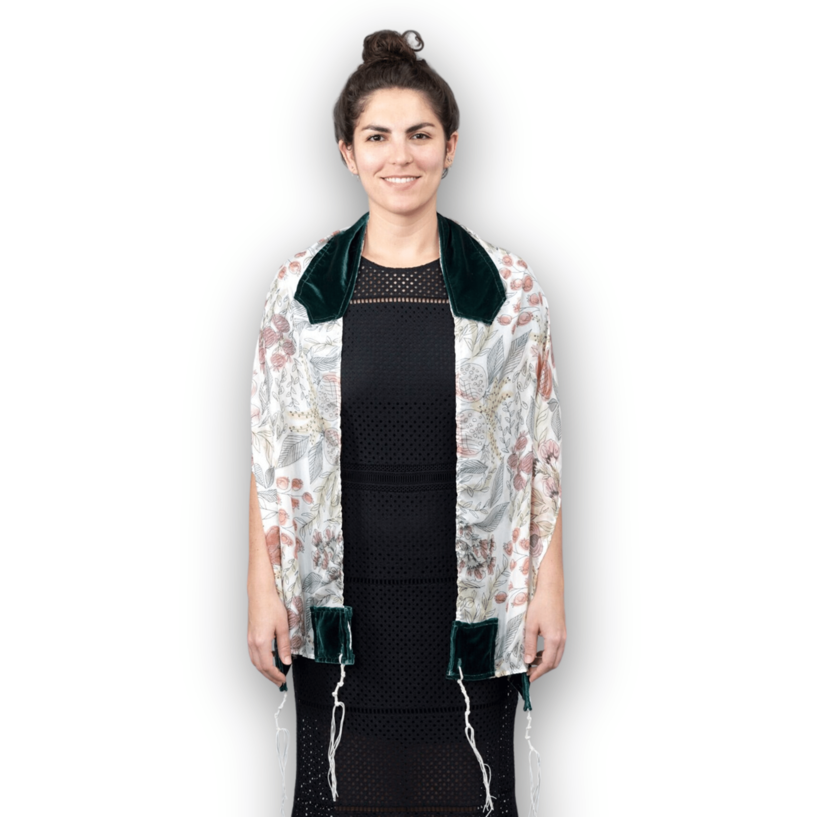 This exceptional tallit showcases a one-of-a-kind design, boasting an exquisite watercolor pomegranate print that was meticulously hand-illustrated and meticulously transformed into a mesmerizing repeat pattern. Crafted from 100% silk habotai, this lightweight fabric drapes with elegance and sophistication. Its atarah, neck piece, and four corners are adorned with lush green velvet silk, contributing to its graceful and luxurious appeal. The tzitzit, meticulously tied by the artisan, are crafted from thick wool, adding a touch of artisanal craftsmanship to this extraordinary piece.