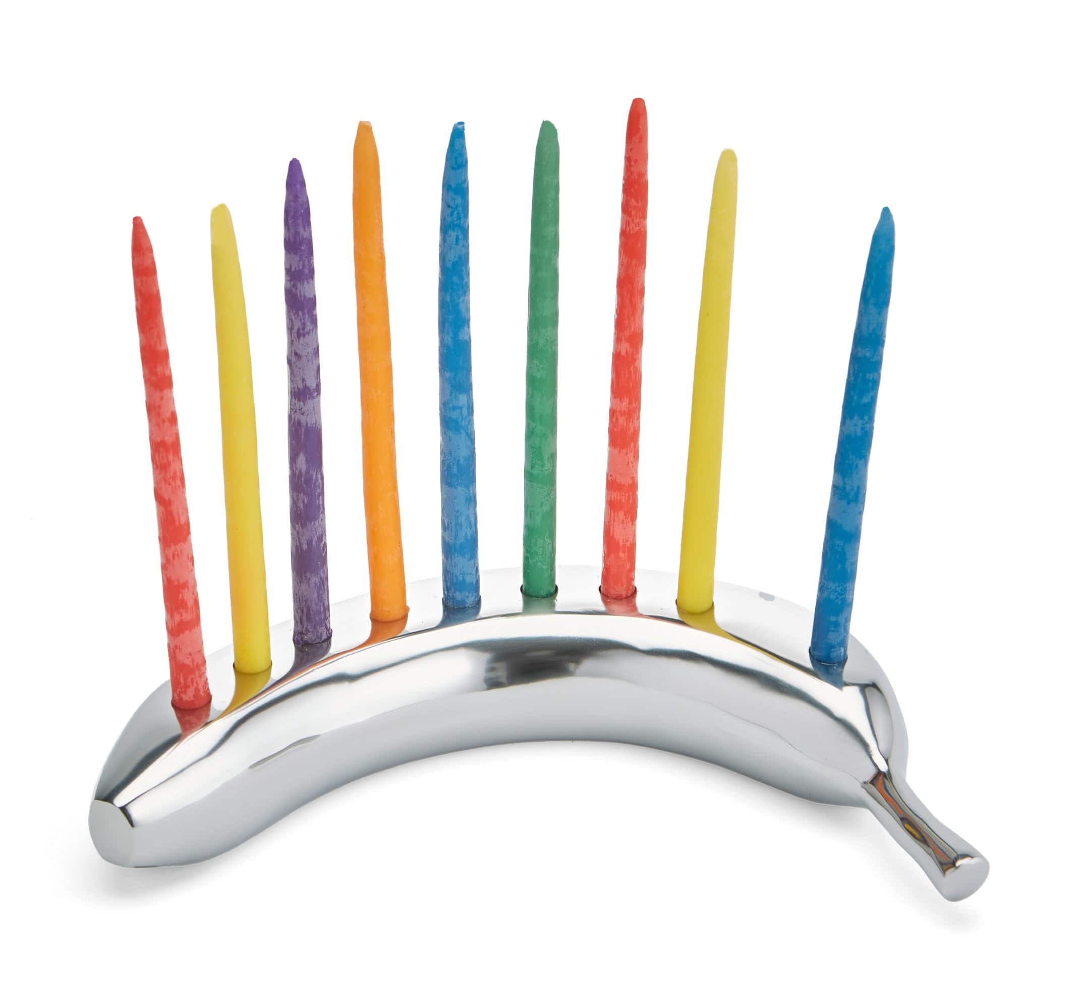 The original Banana Menorah in high-polish stainless steel or brass, with a pop-art aesthetic. The made-to-be-gifted box doubles as compact storage. Includes the optional Shamash Holder to raise the ninth candle.
