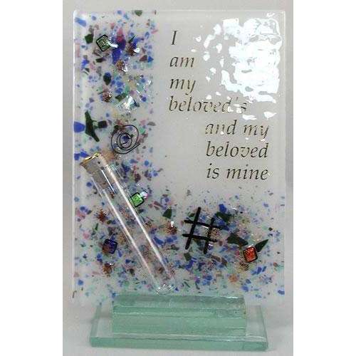 Gorgeous wedding plaque with words from the Song of Solomon, 'I am my beloved's and my beloved is mine.' A tube is mounted on the front to hold the broken wedding glass from the wedding ceremony. The plaque is accented with dichroic glass and metallic dust and mounted on a glass base. Each piece by Sara Beames is cut and then fired in a kiln at 1,400F. At this temperature, the pieces of glass literally fuse, the edges round, and the surfaces take on a brilliant gloss. The art of fusing glass dates back 4,000 years to the Middle East. Sara Beames has always loved working with her hands. While working on her BA in Art History, she was exposed to designing architectural stained glass, and since then, glass has been her love and her avocation.
