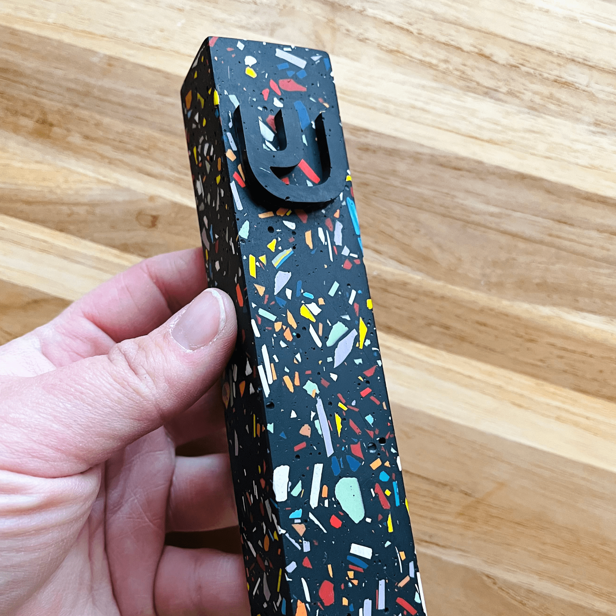 This black and rainbow mezuzah brings a fresh, modern take to a timeless mitzvah. Handcrafted with Jesmonite in a stunning terrazzo style, it��s the perfect way to add a pop of color and joy to your doorway. The smooth, stone-like feel of Jesmonite makes this mezuzah both lightweight and durable, and the matching black Jesmonite shin ties it all together. Whether for your own home or as a meaningful gift, this mezuzah is a stylish way to elevate your Jewish space.