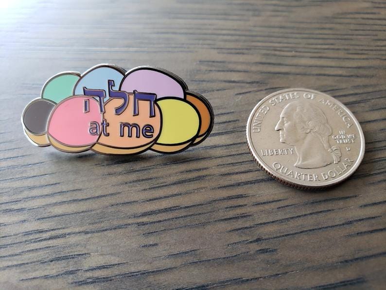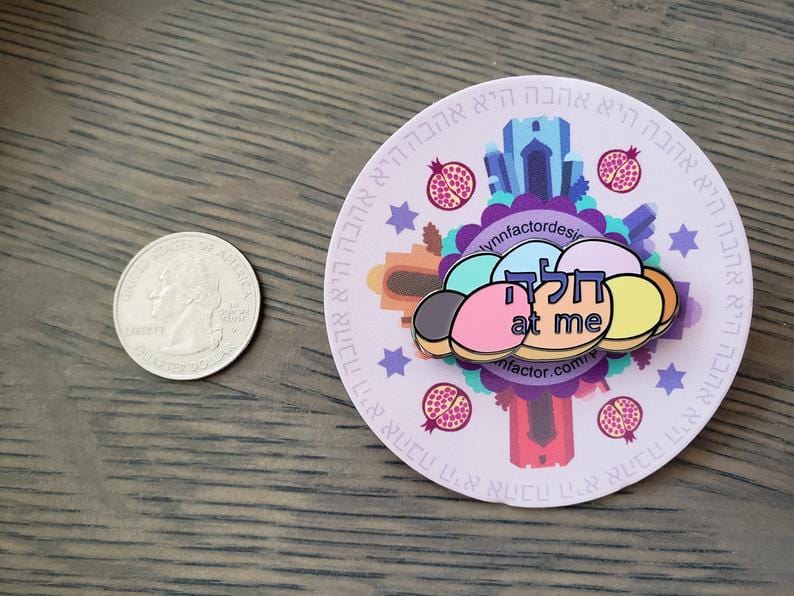 This Rainbow Challah at Me Pin is the perfect way to show off your pride as a Nice Jewish Queer, ally or rainbow lover! This pin is hard enamel with black raised nickel. The challah sits on a lovely Shabbat style plate that reads, 'love is love' in a circular fashion so it goes on forever.
