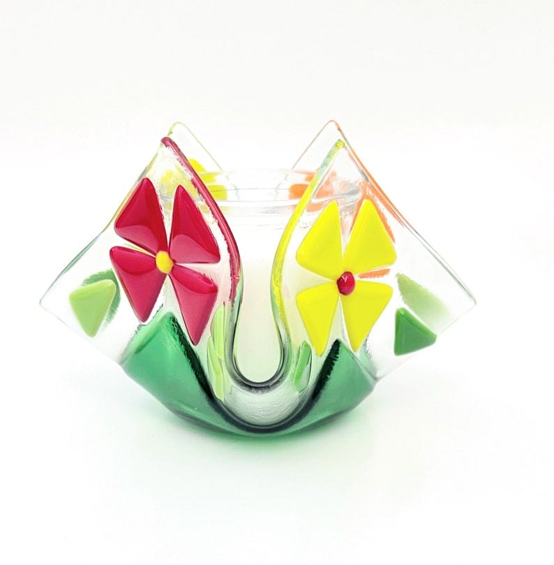 This pretty floral candle holder with a green base is made from fused glass and resembles a spring garden or bouquet of flowers.