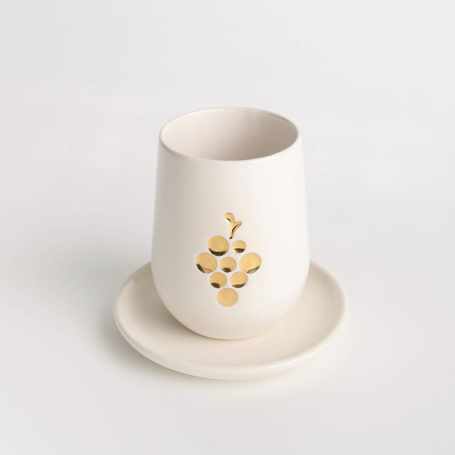 This modern ceramic Kiddush cup is minimalist, clean and simple, and has a perfect glazed finish. A�beautiful 24k gold illustration is engraved on the outside of the ceramic cup to symbolize the Gefen (grapevine), and gives the cup a luxurious perfect look. An accompanying saucer with a matching design is included and will keep your wine from spilling.