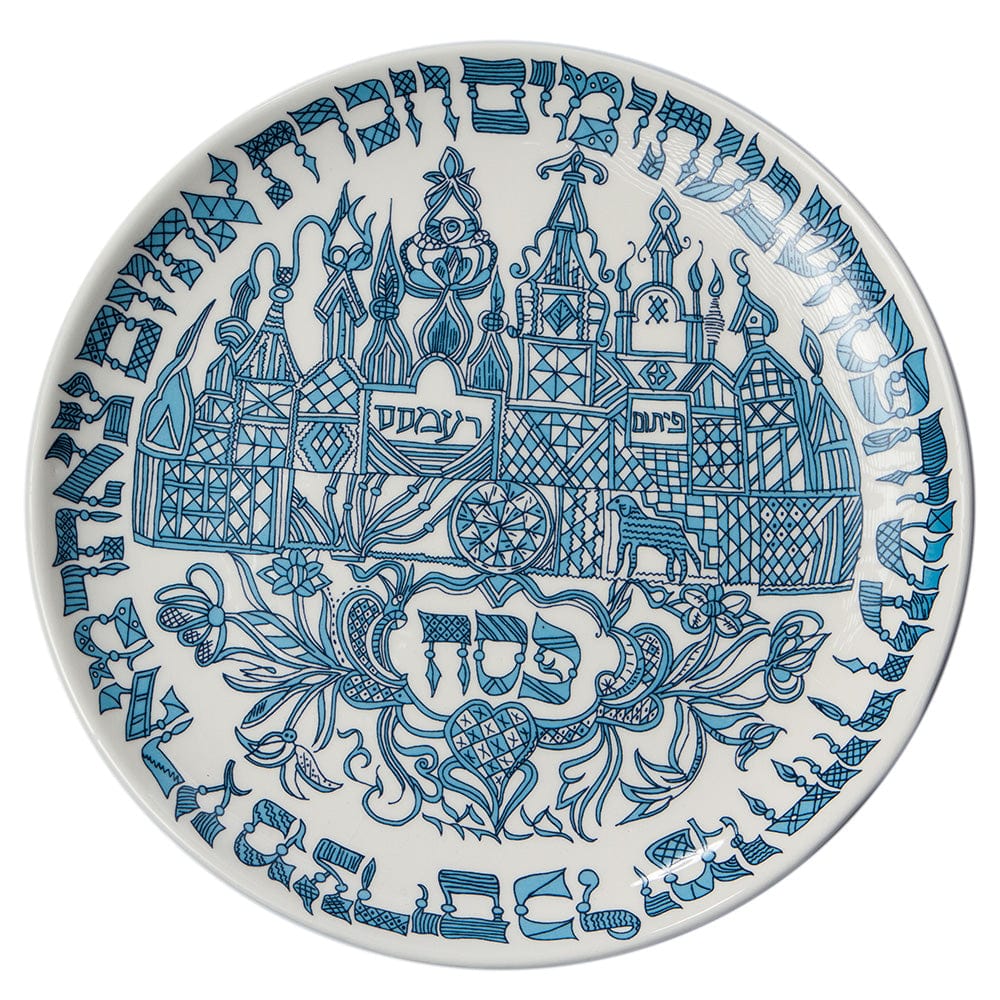 Elevate your Passover table with this elegant blue ceramic Seder plate and matching bowls, inspired by 18th-century Jewish craftsmanship from Southern Germany. This plate, a beautiful blend of tradition and artistry, replicates the engraved lines of folk embroidery found in Jewish crafts of the era. The intricate design depicts Pithom and Ramses as European cities with towers and spires, echoing the rich visual traditions of Passover Haggadah illustrations.�Whether used during Passover or as a decorative piece year-round, this plate adds a timeless, festive touch to your home.