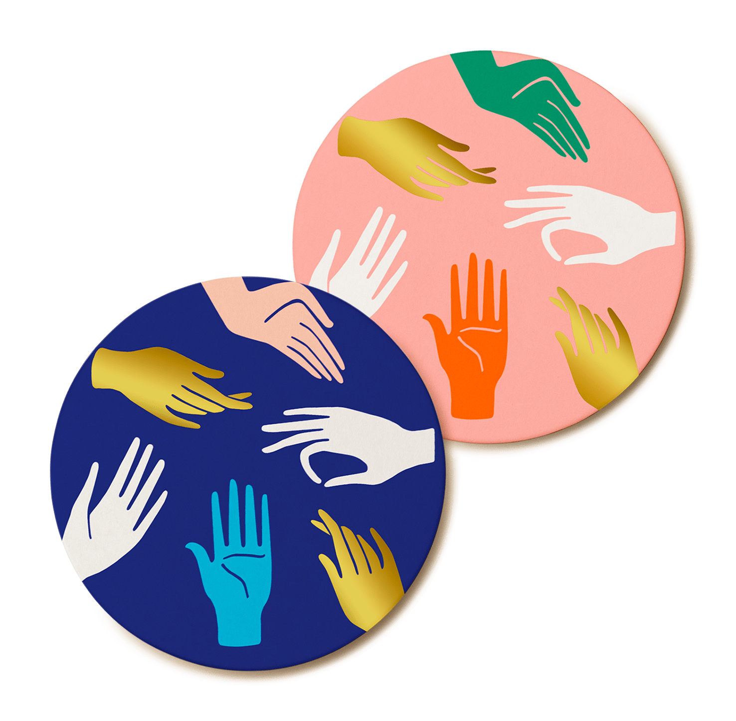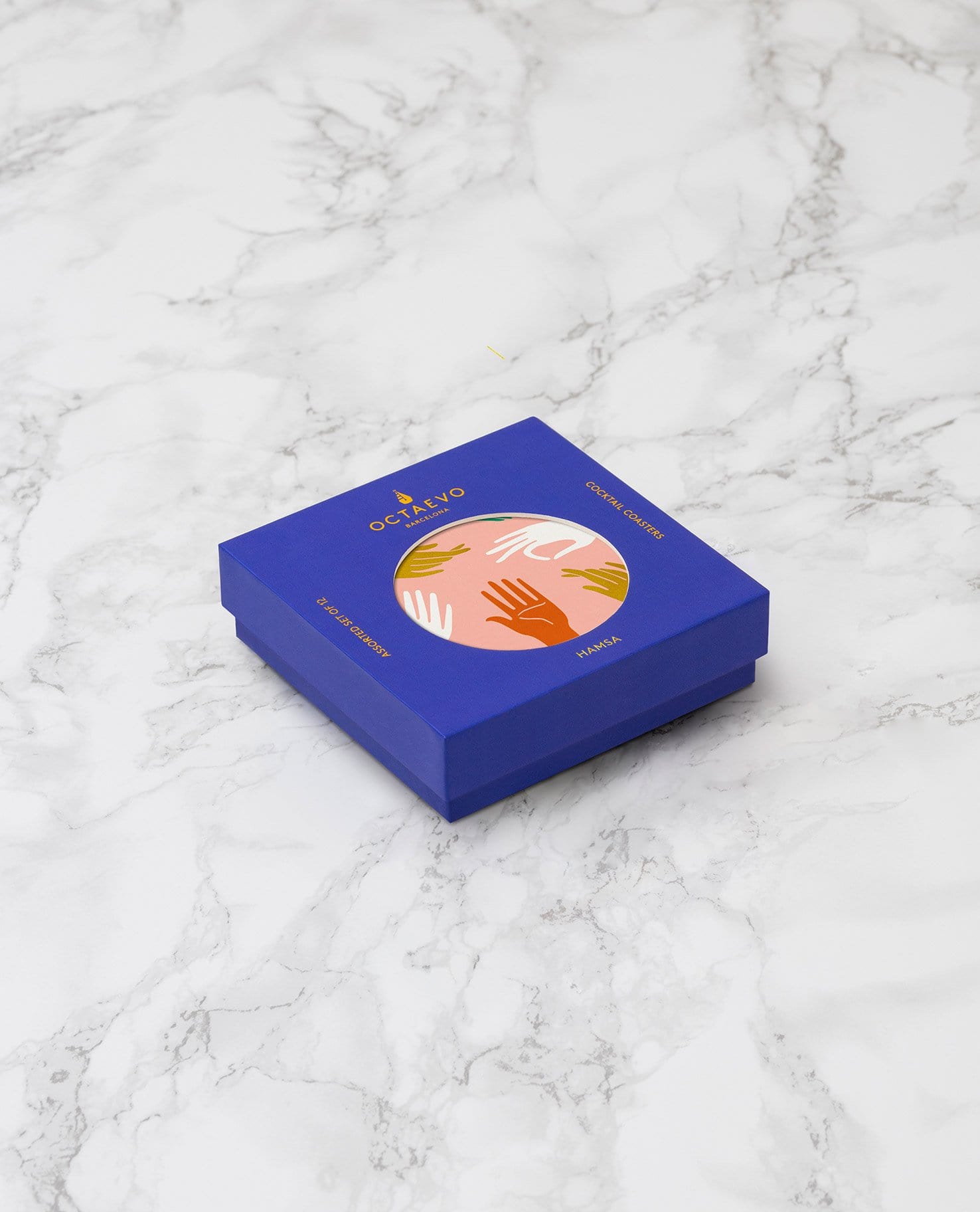 This set of 12 original coasters features our signature print of Hamsa, the ancient protective symbol of the hand. May it bring you happiness, luck, health, and good fortune.