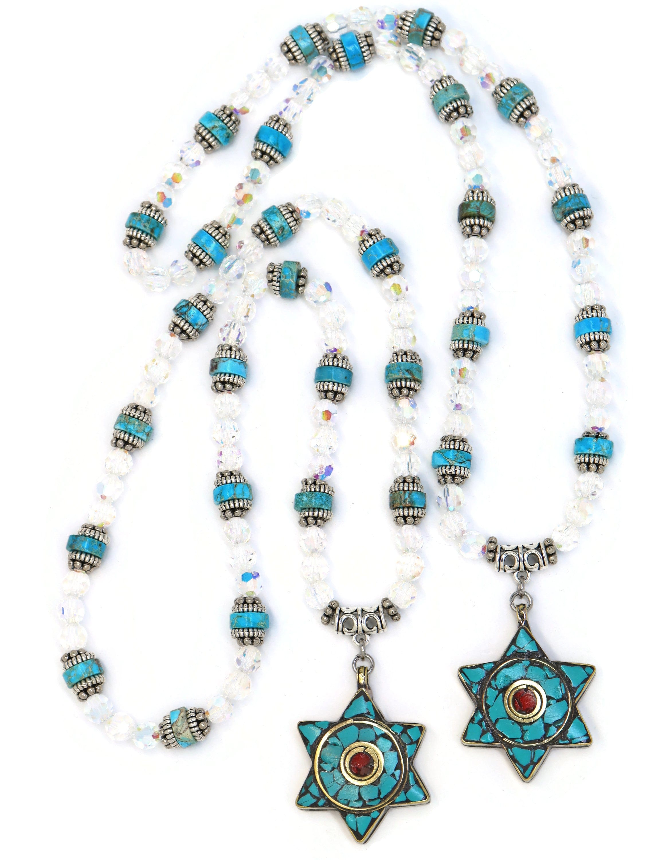 This eye-catching stretch over-the-head necklace features a beautifully detailed Star of David charm, ethically crafted from fair trade materials sourced from Nepal. Vibrant imperial jasper stones are paired with dazzling Aurora Borealis Czech crystal glass beads, creating a unique and meaningful design. The natural stones ensure each necklace is one-of-a-kind, with slight variations in color, pattern, and bead size adding to its individuality. Handmade in the USA, this necklace is both stylish and thoughtful.