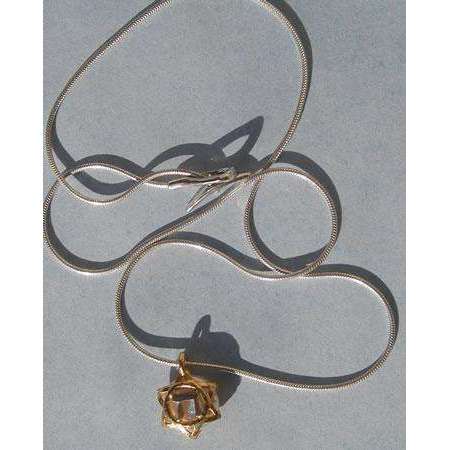 Michael Bromberg brings us this delicate 14K gold and pearl Jewish Star of David necklace with a Chai on one side and a Shin on the other side. This simple, yet eye catching, Jewish Star necklace has a 14K gold framework enclosing a stunning pearl and hangs on a contemporary sterling silver snake chain. This necklace would be the perfect Bat Mitzvah gift as it is priced right and is very pretty. The lovely two tone effect is very current and fashion forward. This is a Bat Mitzvah gift that you would be proud to give! Also perfect for a Jewish grandmother that you love or for anyone who appreciates fine handmade Jewish jewelry!