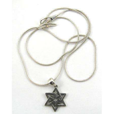 This beautiful sterling silver Jewish Star pendant has detailed lines throughout. It is set on a sterling silver snake chain with a toggle style clasp.