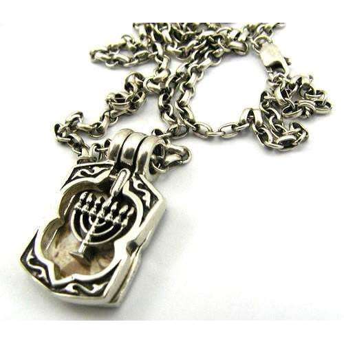 Truly multi-dimensional, this eye-catching photo locket pendant is sure to be a conversation piece. The top piece opens and, when it does, the menorah moves independently, like a charm. The back piece holds a cherished photo and the whole pendant hangs on a substantial sterling silver chain.