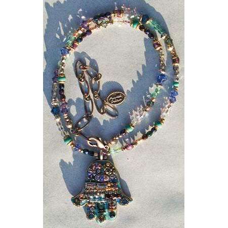Strong blue Michal Golan hamsa necklace made with abalone and Swarovski crystal.Jewish Gift Place carries the entire Michal Golan collection.