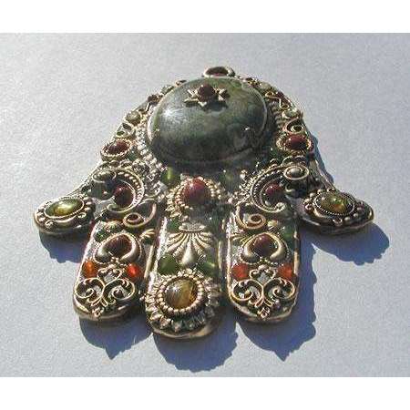 The Wall Hamsa is an amulet of protection for your home. It symbolizes the hand of God and is, in all faiths, a protective sign. The perfect housewarming gift, this hamsa features a very earthy design comprised of abalone, African turquoise and red jasper. The large center stone holds a Star of David. This piece is very similar to GL-35 but done in a different coloration.If you love the symbology of the hamsa hand, check out our entire hamsa collection.