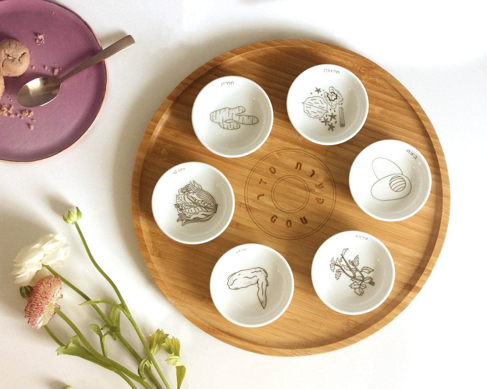 - The set contains a bamboo wood seder plate and 6 white porcelain bowls