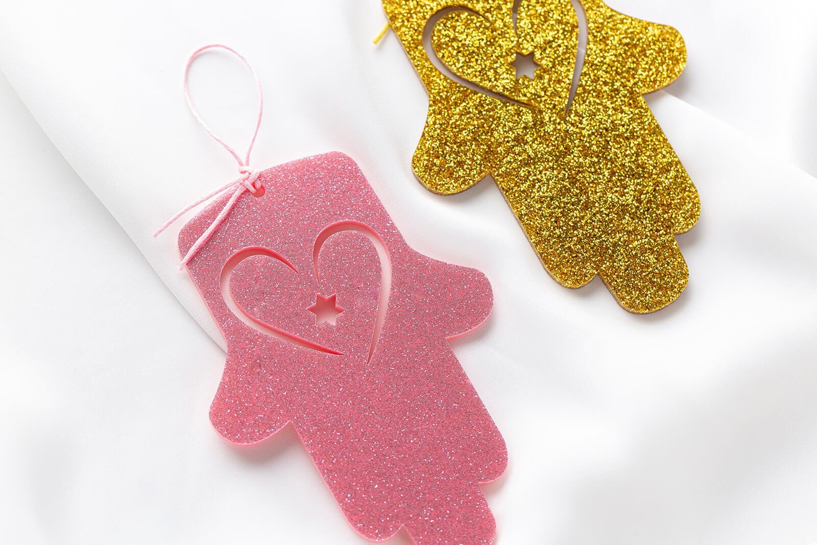 Modern acrylic hamsa with Heart and Magen David motifs.�