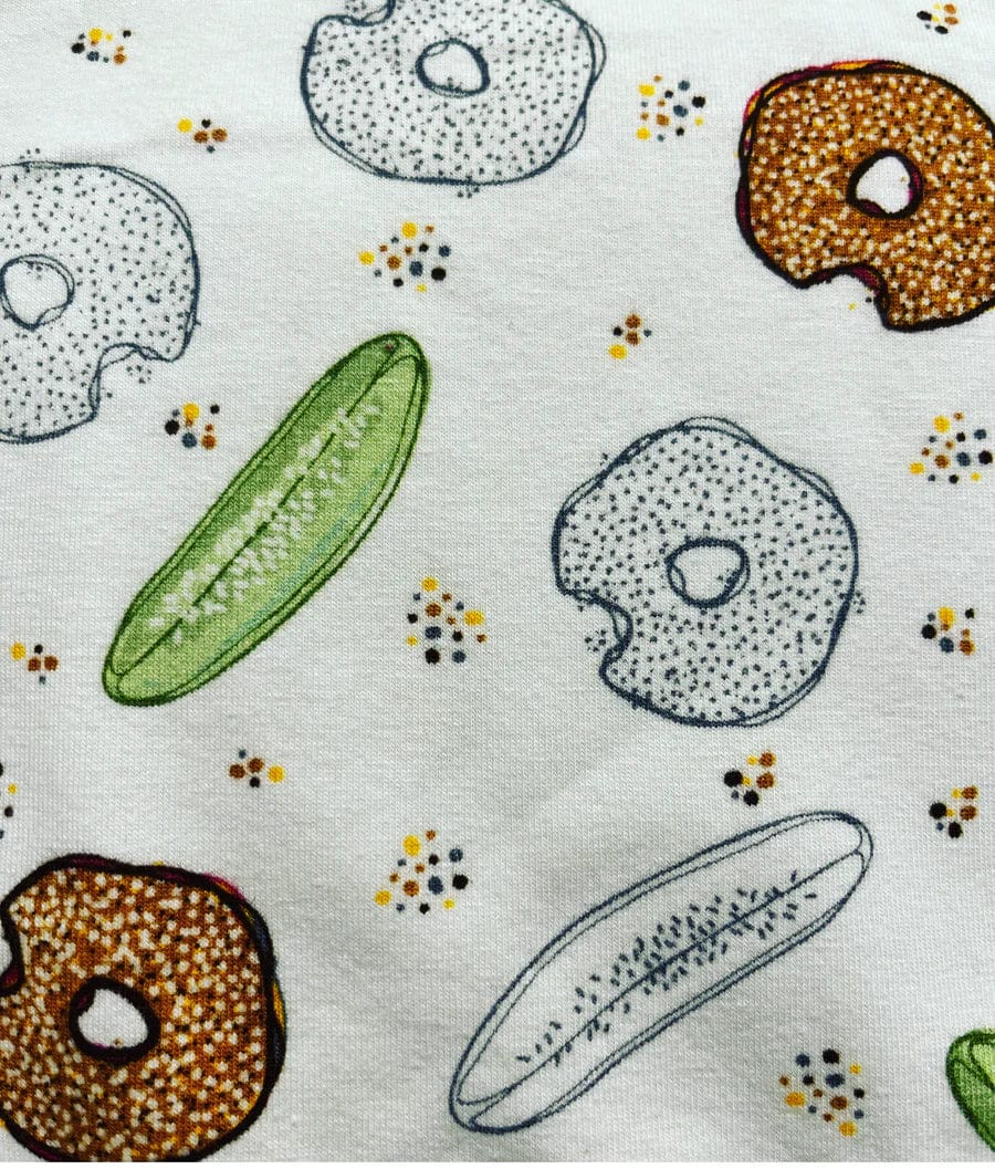 Our favorite�foods�gets�their own pajamas!�Fun print featuring bagels, schmear and pickles with a pink trim. Perfect to wear on lazy Sunday mornings.