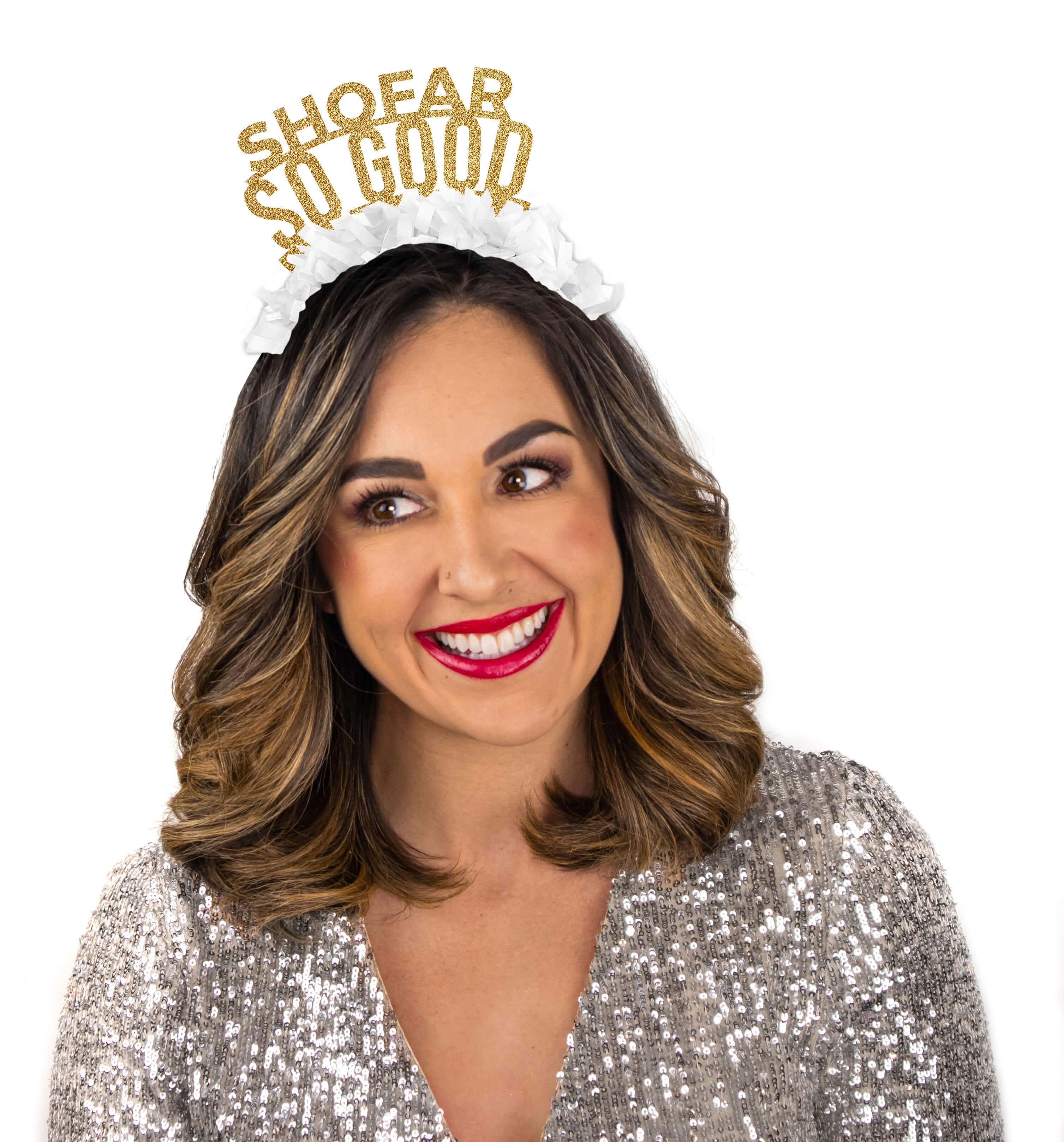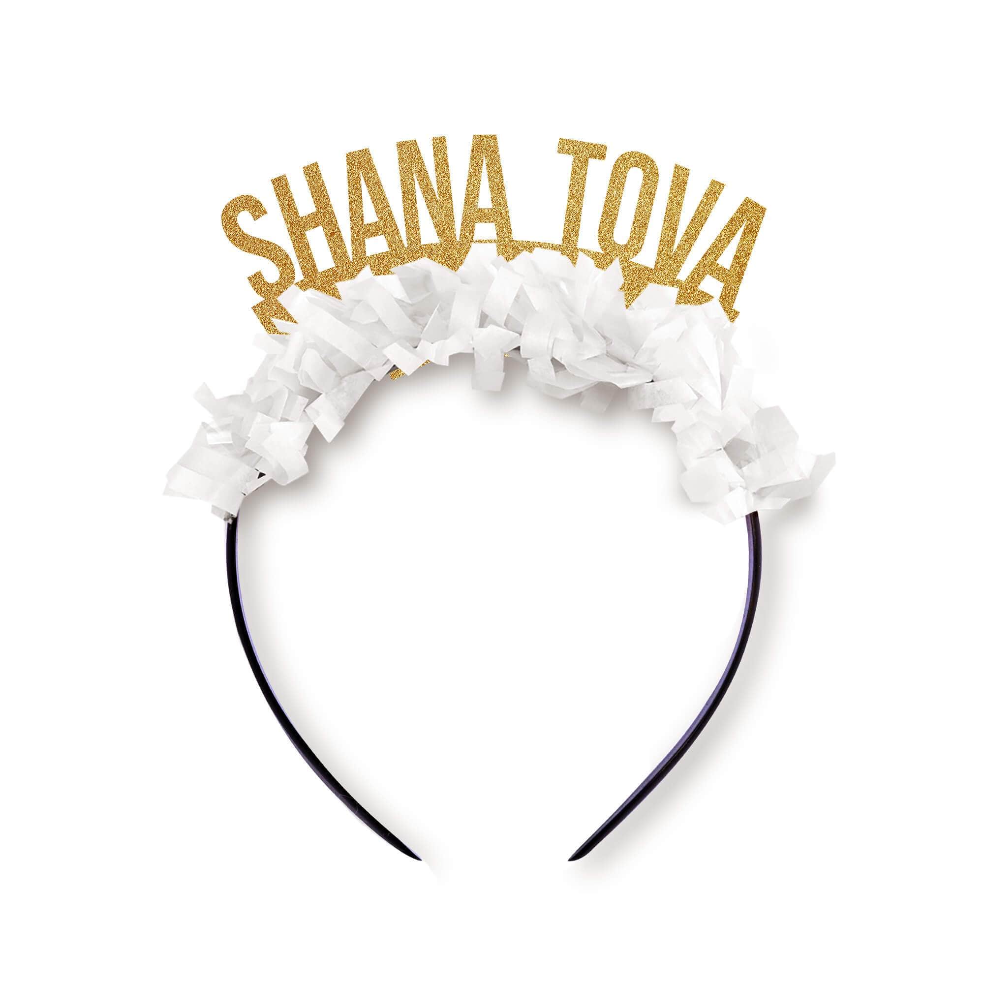 These Shofar So Good�and Shana Tova Headbands are the perfect�Rosh Hashanah�wear�for your High Holidays celebrations!�Choose a saying; one headband per order. Made with�gold card stock lettering on a plastic headband.