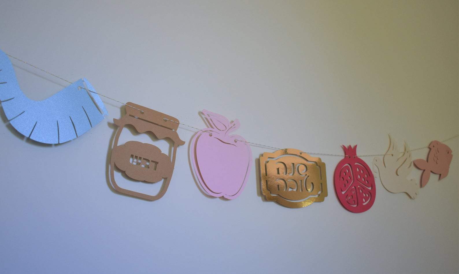 This Rosh Hashanah symbols garland has seven popular holiday symbols: Pomegranate, Apple, Honey, Fish, Shofar, Dove and a Shana Tova card for a sweet new year!
