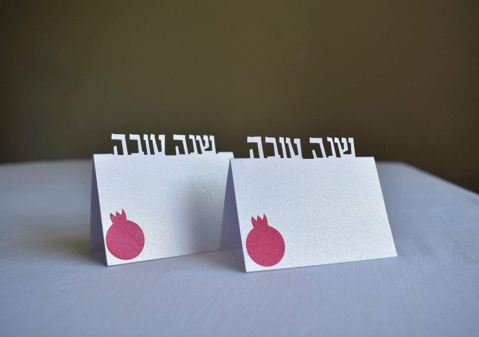 Working on your Rosh Hashanah sitting arrangement? Our Shana Tova place cards will add the perfect touch to your beautiful table. Made with card stock in white with a shimmer finish, with an addition of a red pomegranate.