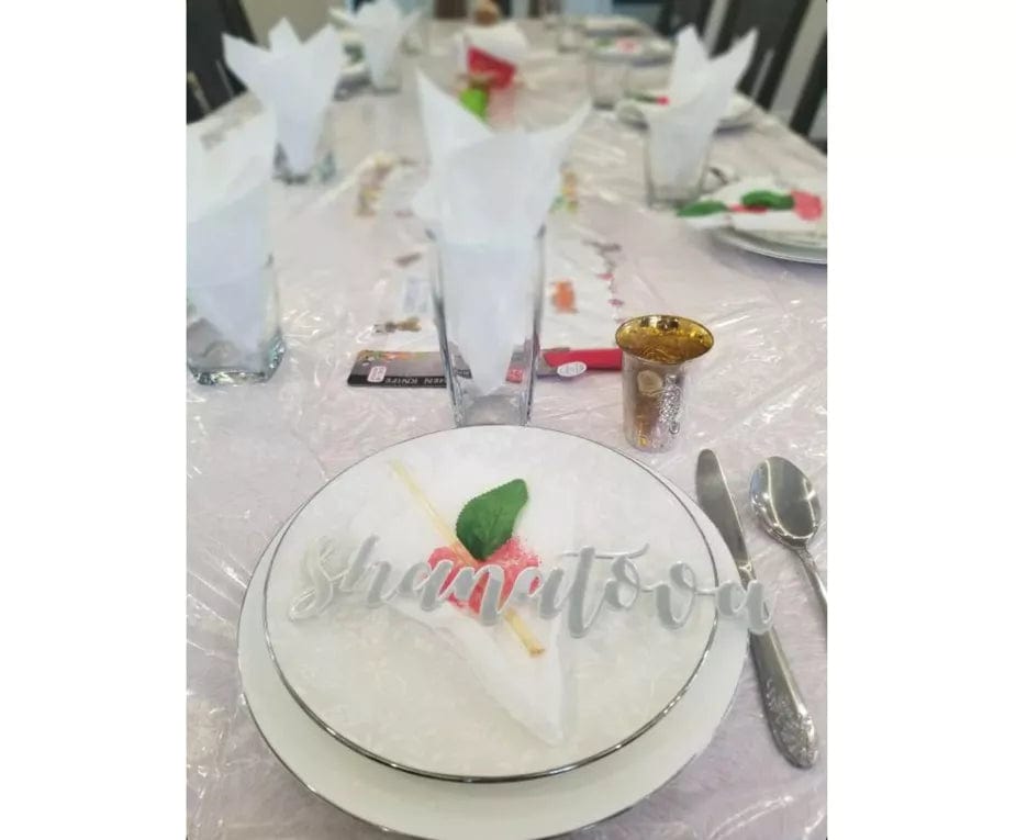 Let these silver Shana Tova Place Setting Words锘� grace your Rosh Hashanah tablescape. Crafted with durability in mind, these place settings can be enjoyed and reused for future celebrations. Each pack contains four pieces, ensuring you have everything you need to create a stunning table arrangement for Rosh Hashanah.