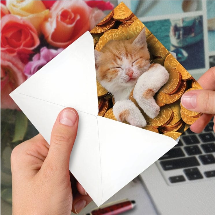 Ever wonder what your feline friends are up to while you're lighting the menorah? Evidently, they're on a mission to outshine the Hanukkah candles by swimming in a sea of gelt! These Sleepy Cat in Gelt cards combine the two best things in life: adorable cats and irresistible Hanukkah chocolates. Perfect for cat lovers, chocolate lovers, and well... everyone else too!
