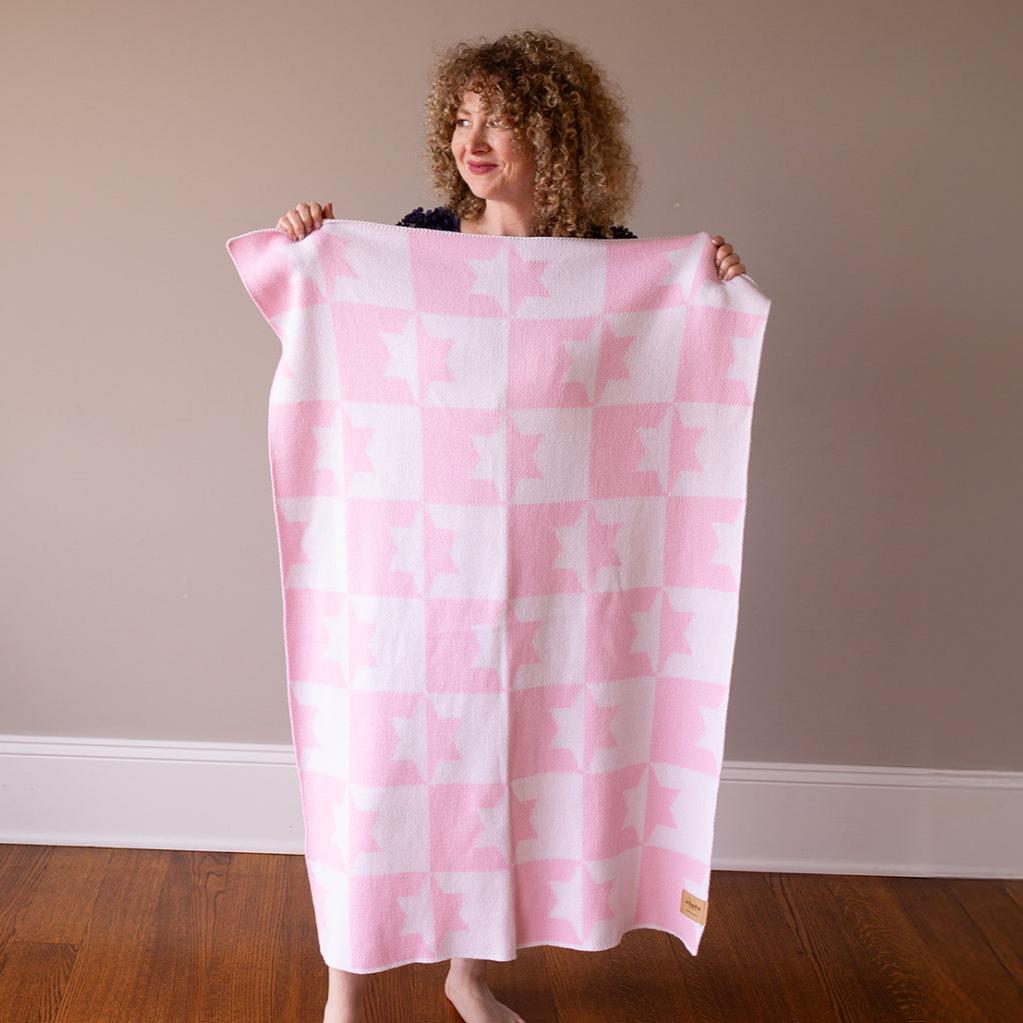 Wrap your little one in comfort and culture with our Star of David Baby Blanket in light pink and white. This ultra-soft, machine-washable blanket is crafted with care in the USA using a 50% recycled cotton and 50% recycled polyester blend. The reversible design features a beautiful Star of David pattern, symbolizing resilience and hope, making it both practical and meaningful. Perfect for everyday use, this heirloom-quality piece is designed to be a lasting family treasure, blending timeless style with Jewish pride.