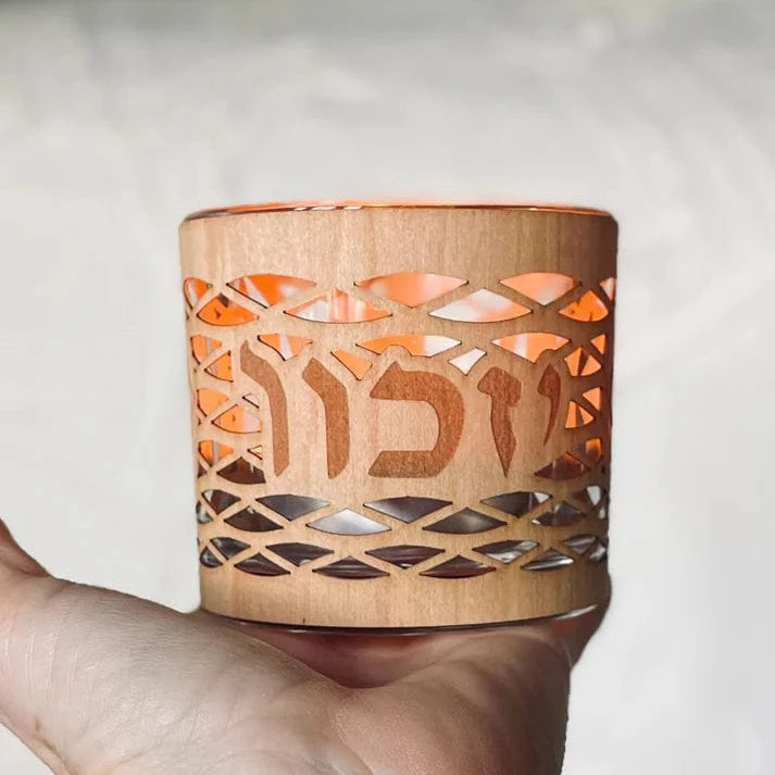 Honor the memory of loved ones with the elegantly designed Maple Yahrzeit Candle Holder. This tribute blends a contemporary aesthetic with thoughtful functionality, featuring a thick, durable glass container and a natural maple veneer for a refined, timeless look. The glass container, nearly 1/2�� thick, stays cool on the outside and bottom, ensuring safety even after hours of use. The natural maple veneer wraps securely around the glass with brass eyelets, allowing effortless removal for cleaning. Enjoy a serene glow for approximately 24 hours.