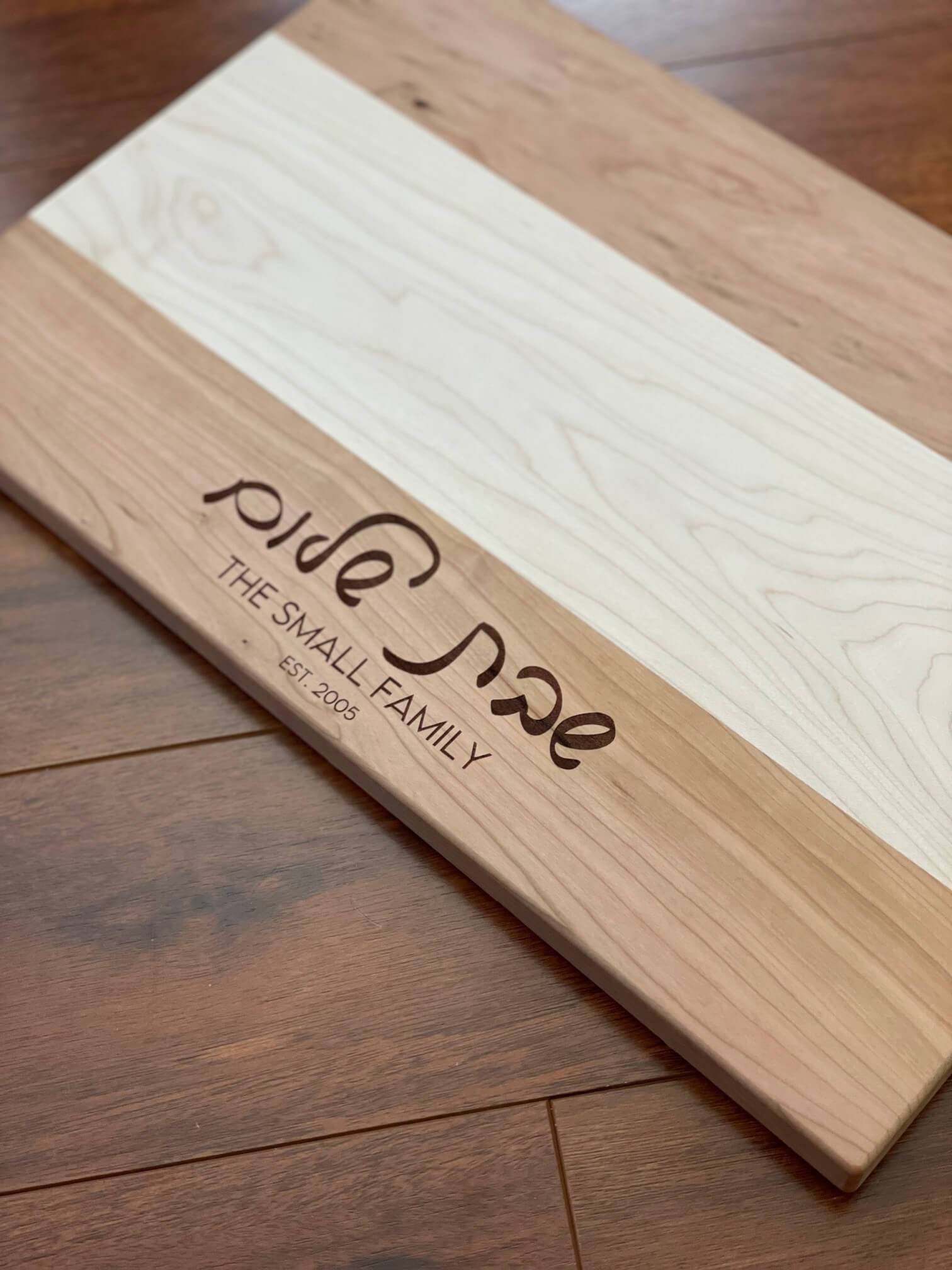 This gorgeous hand-engraved Personalized Tri-Color, Cherry or Maple Wood Challah Board is customized to make it your own. Makes the perfect wedding, retirement, or special occasion present. This custom made challah board is made from a mixture of maple and cherry wood or all maple, and up to�50 characters on each of the two lines below�the Shabbat Shalom cursive Hebrew engraving. Wood colors may cary due to the handmade nature of this piece.