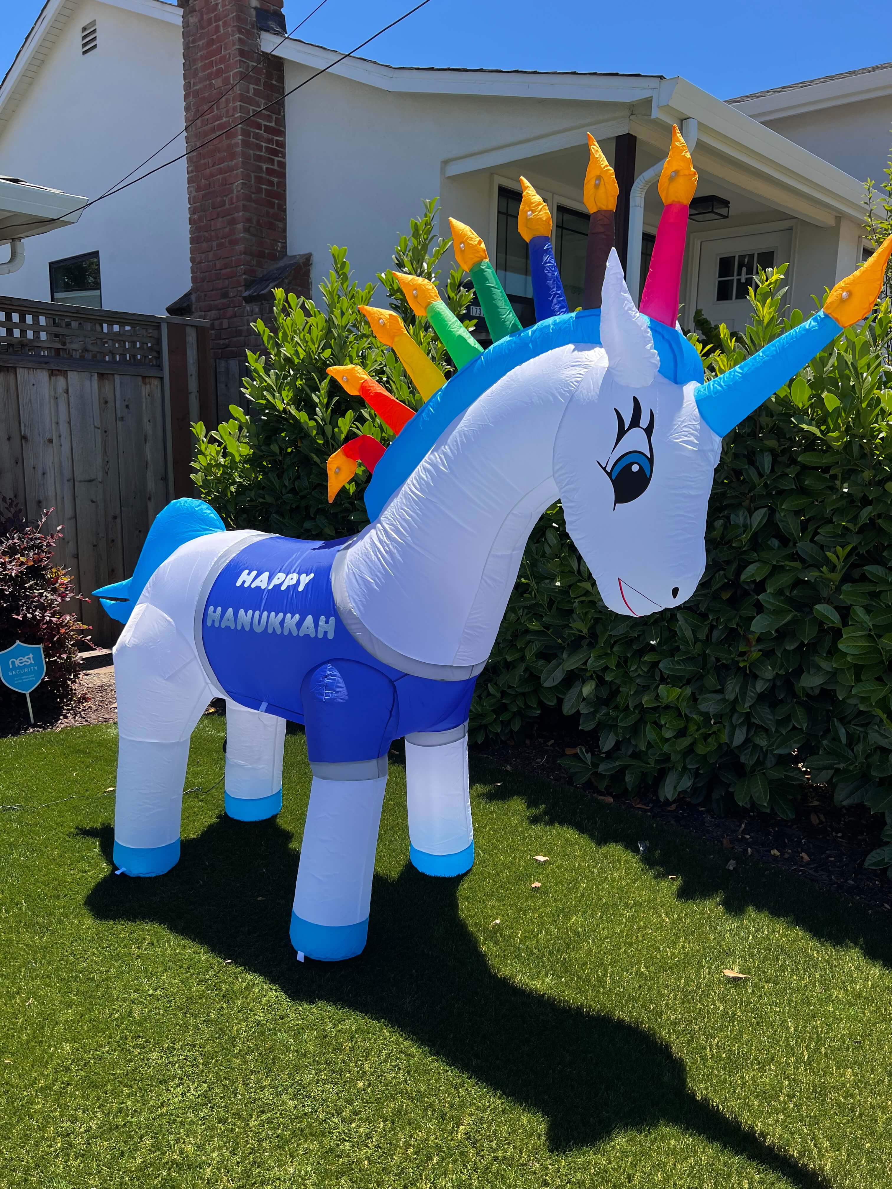 This enchanting unicorn is the perfect addition to your Hanukkah decorations, bringing a touch of whimsy and fun to your holiday celebrations.�Your kids will love the chance to celebrate in their own unique way, and be a part of the holiday season with a light up, inflatable, Hanukkah-celebrating Unicorn.�