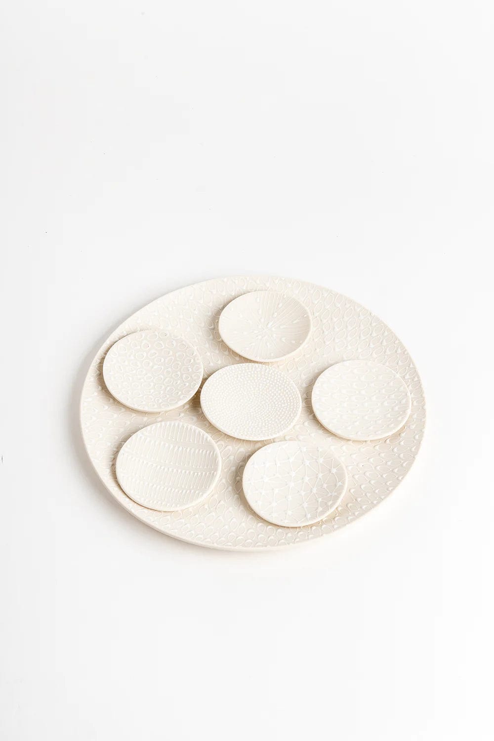 Handcrafted White on White Pattern Seder Plate made using slip-casting technique and then hand-decorated with unique patterns. Each plate consists of 6 individual bowls for the symbolic seder foods and a coordinating platter. Seder plates are non-toxic, dishwasher-safe, and food-safe.