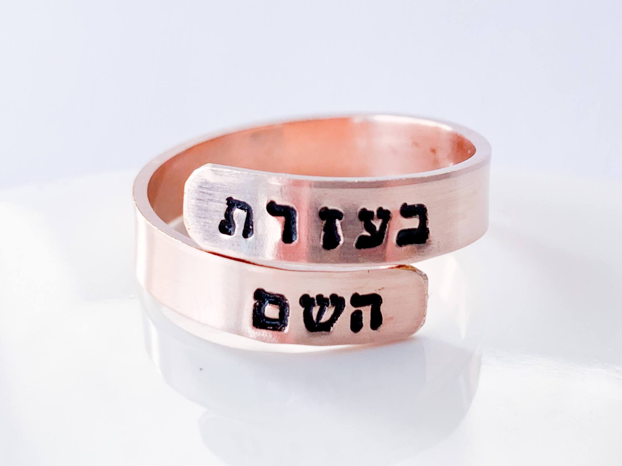 With the help of HaShem is hand stamped in Hebrew onto this wraparound ring. These make great gifts since they are adjustable. �Order the size nearest your usual ring size and you can adjust this ring a size up or down very easily.
