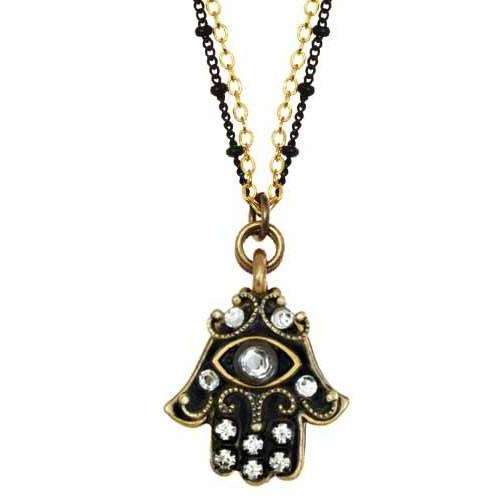 Michal Golan Black and Gold Hamsa Necklace with Evil Eye with Silver Crystals