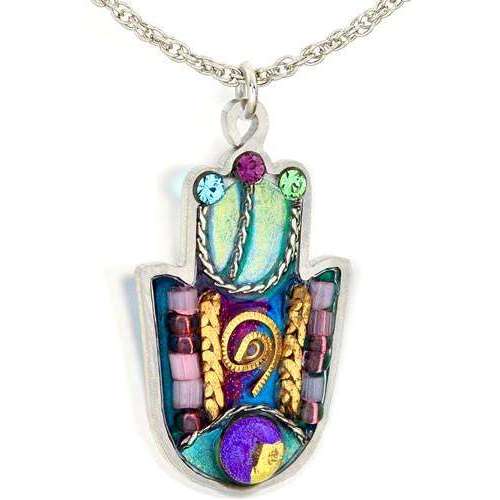Michal Golan Hamsa Necklace in Blue and Green Crystal with Evil Eye