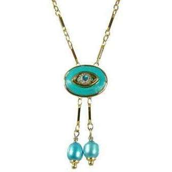 Michal Golan Amber, Teal and Gold Evil Eye Oval Pendant with Drop Beads