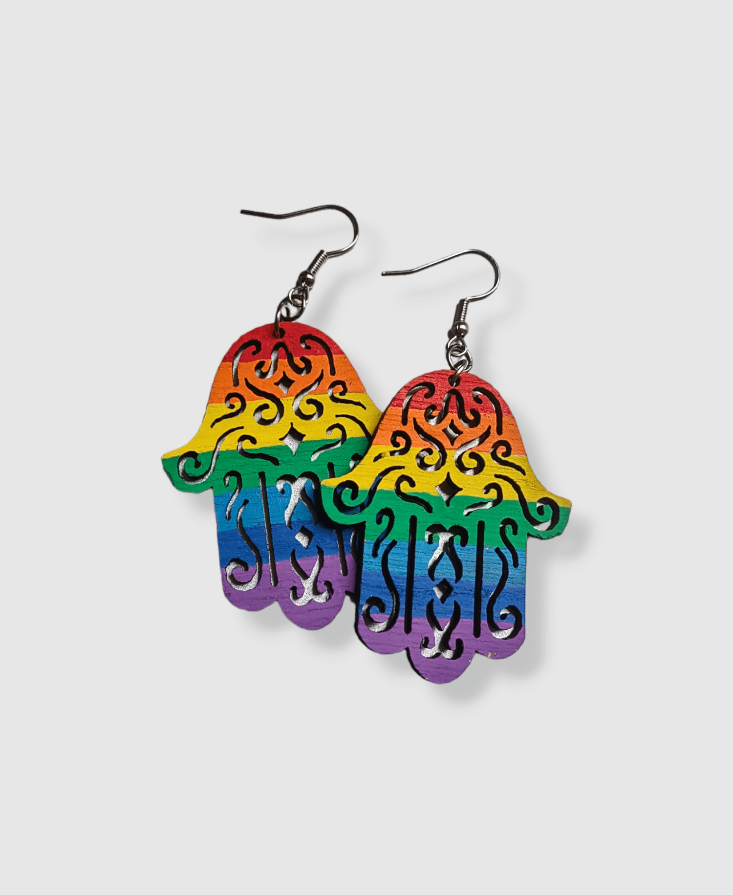Wooden Rainbow Hamsa Earrings