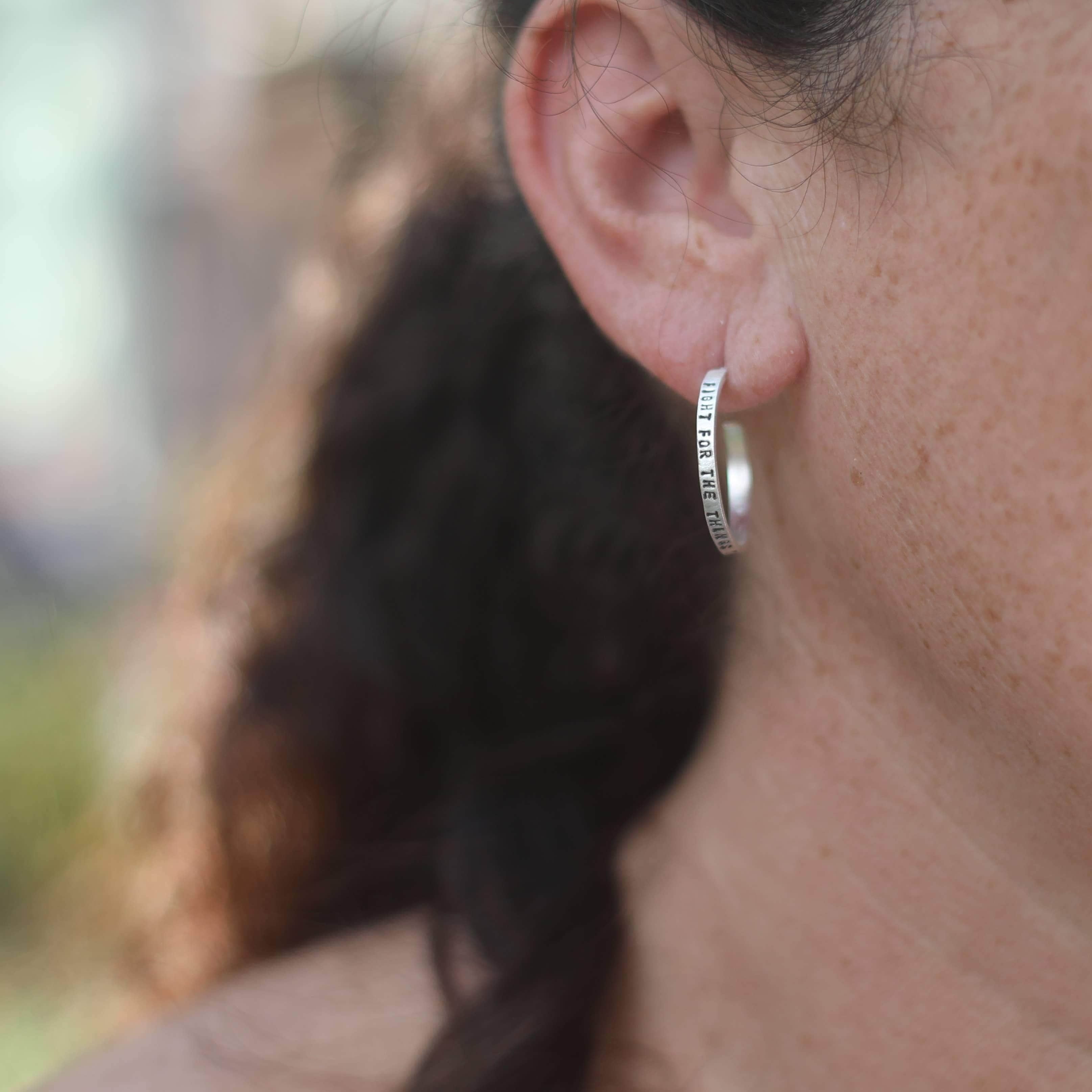 Modern, simple shaped hoops accented with hand stamped quotes. Handcrafted by artisan Chocolate and Steel. Available in sterling silver or 14kt gold vermeil (gold plated sterling silver).�With the quote by Ruth Bader Ginsburg 'Fight for the things you care about'.