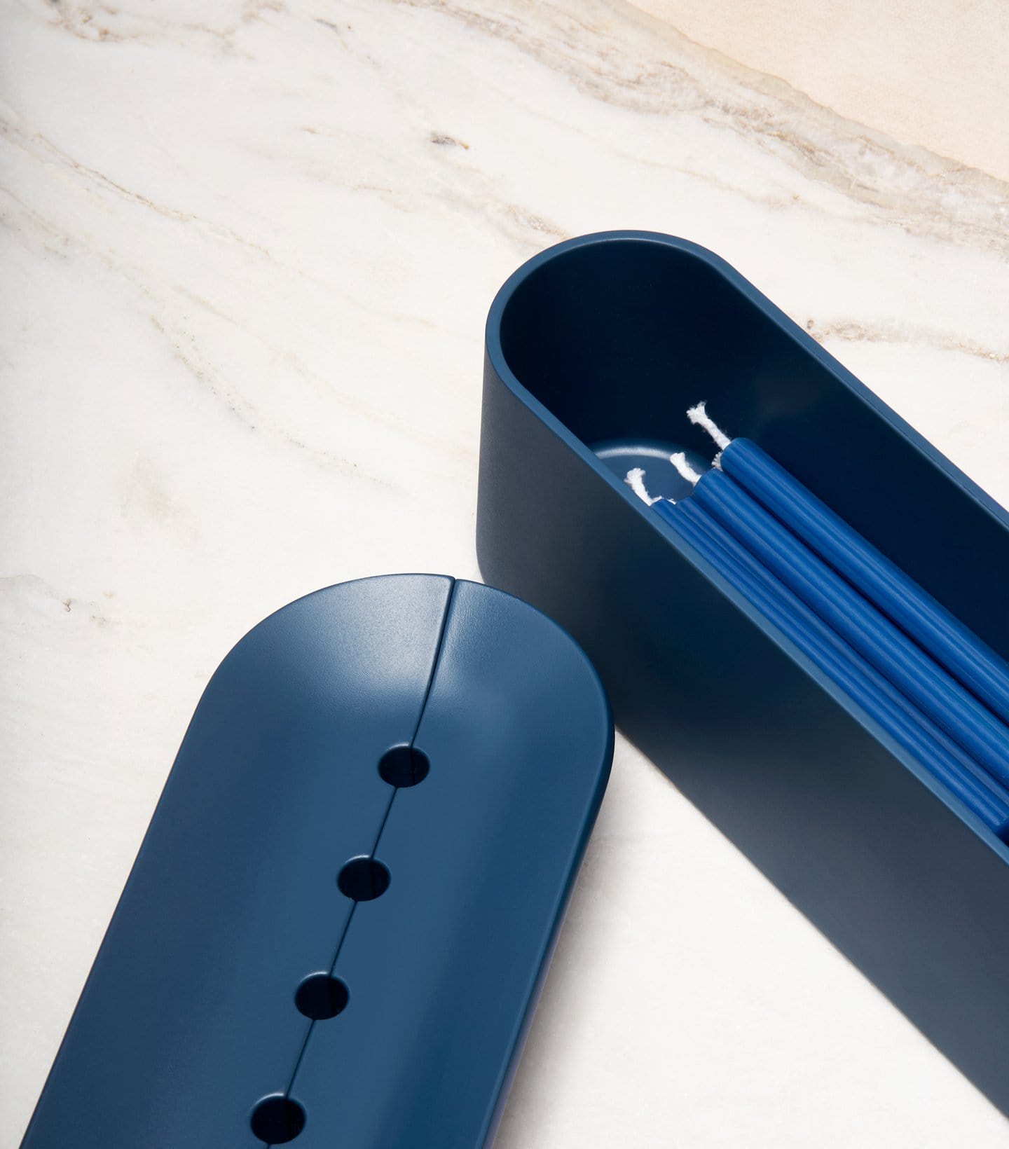 This heavy cast aluminum chanukiah brings practicality to a timeless ritual. When removed from the base the candleholder's two parts can be separated, making the chanukiah exceptionally easy to clean. Beneath the candle holder platform is a storage compartment with room for 44 candles��enough for the eight nights of Chanukah. A gently raised center spot elevates the shammash. The Block is a substantial form, weighing four pounds.