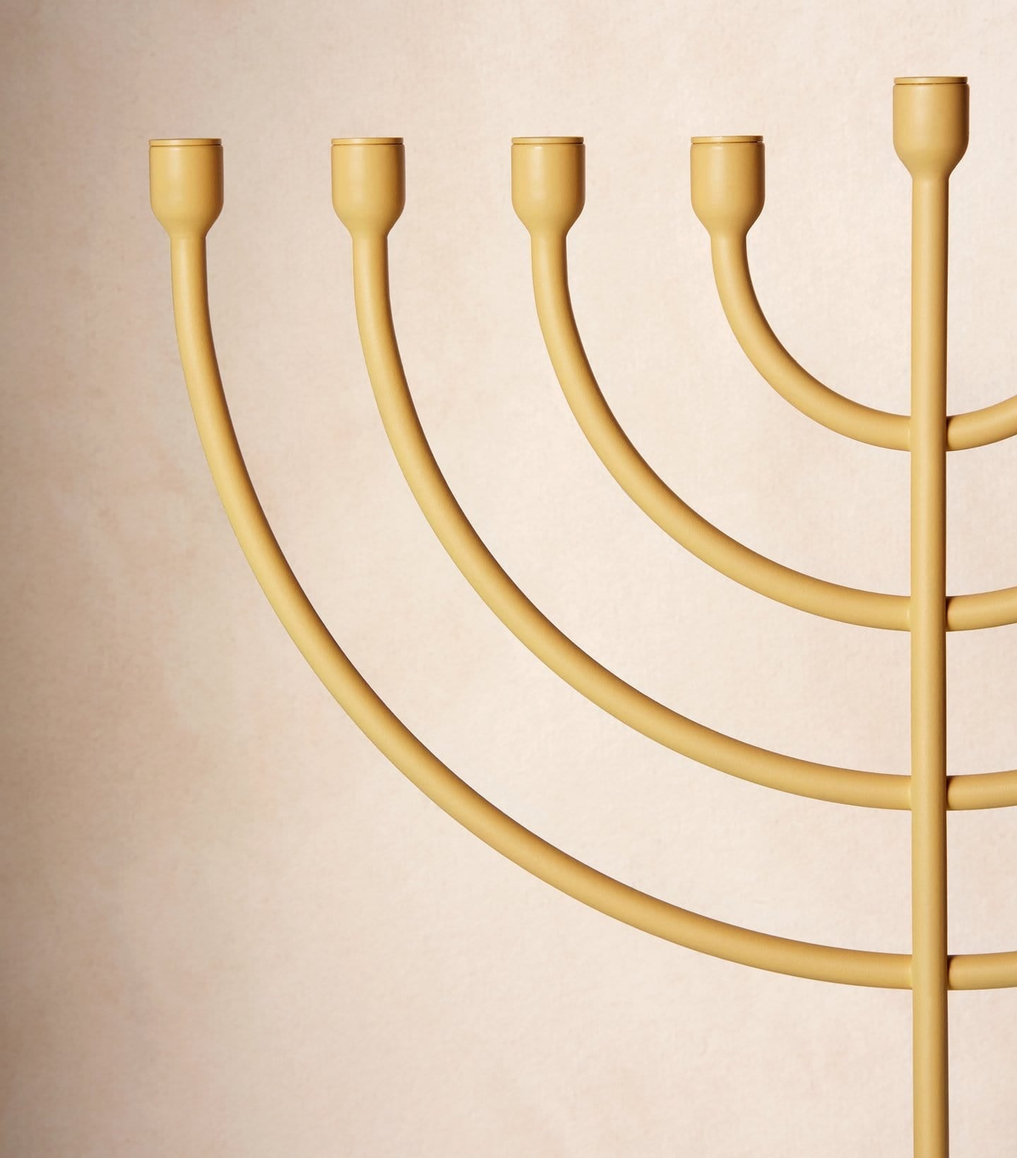 This�steel chanukiah reinterprets a classic form through the use of industrial materials and processes. The steel tubes that form the arms of the chanukiah are swaged open with friction, creating the space to hold a candle and translating this often overlooked technique into a decorative detail. The nine removable cups that hold the candles allow for easy cleaning and ensure a secure hold.