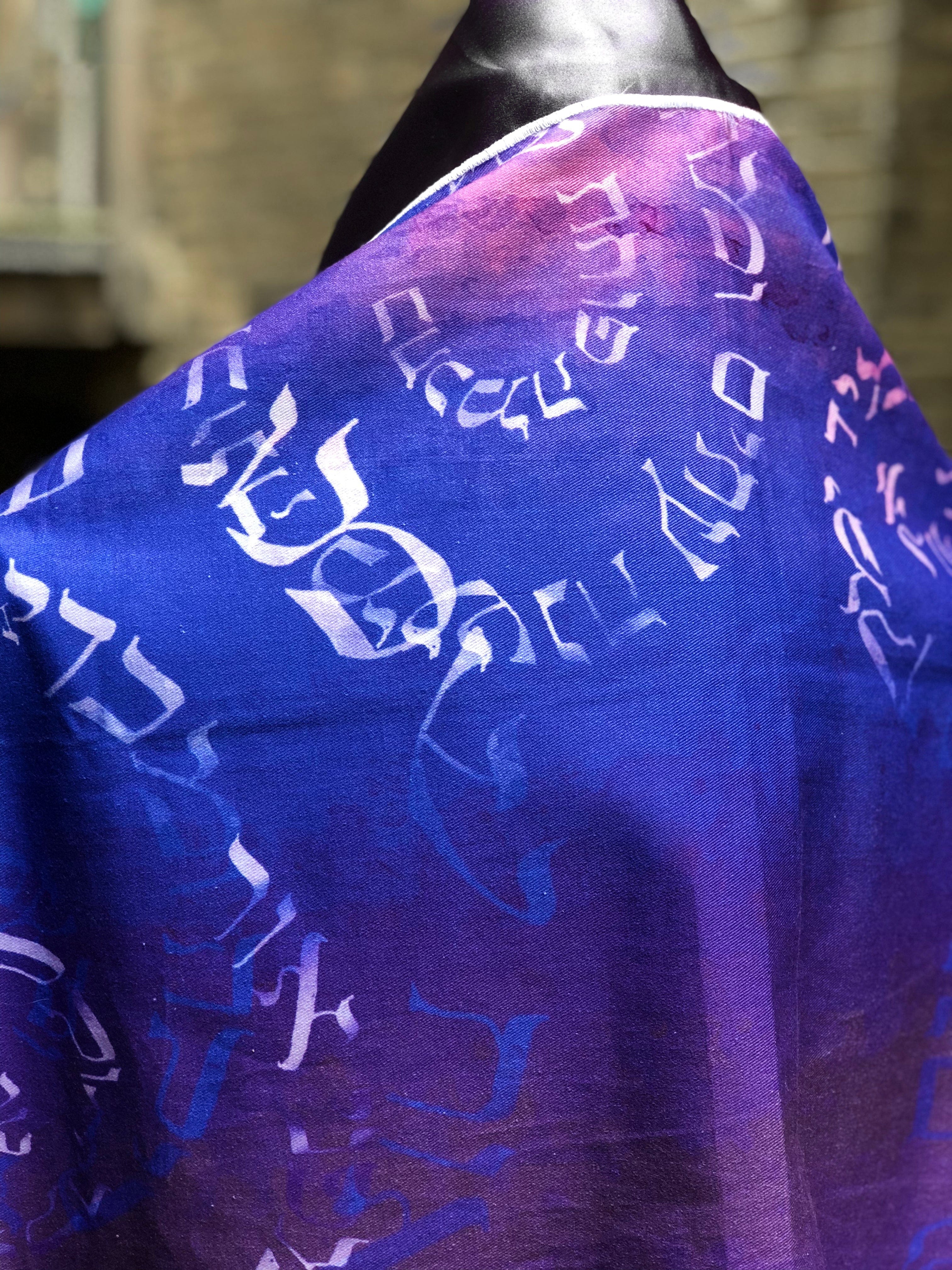 The text on the tallit reads in Hebrew: Praised are You, Lord our God, Sovereign of the universe whose word brings the evening dusk. You open the gates of dawn with wisdom, change the day��s divisions with understanding, set the succession of seasons, and arrange the stars in the sky according to Your will. You create day and night, rolling light away from darkness and darkness away from light, Eternal God. Your rule shall embrace us forever. Praised are you, Lord, for each evening��s dusk.��