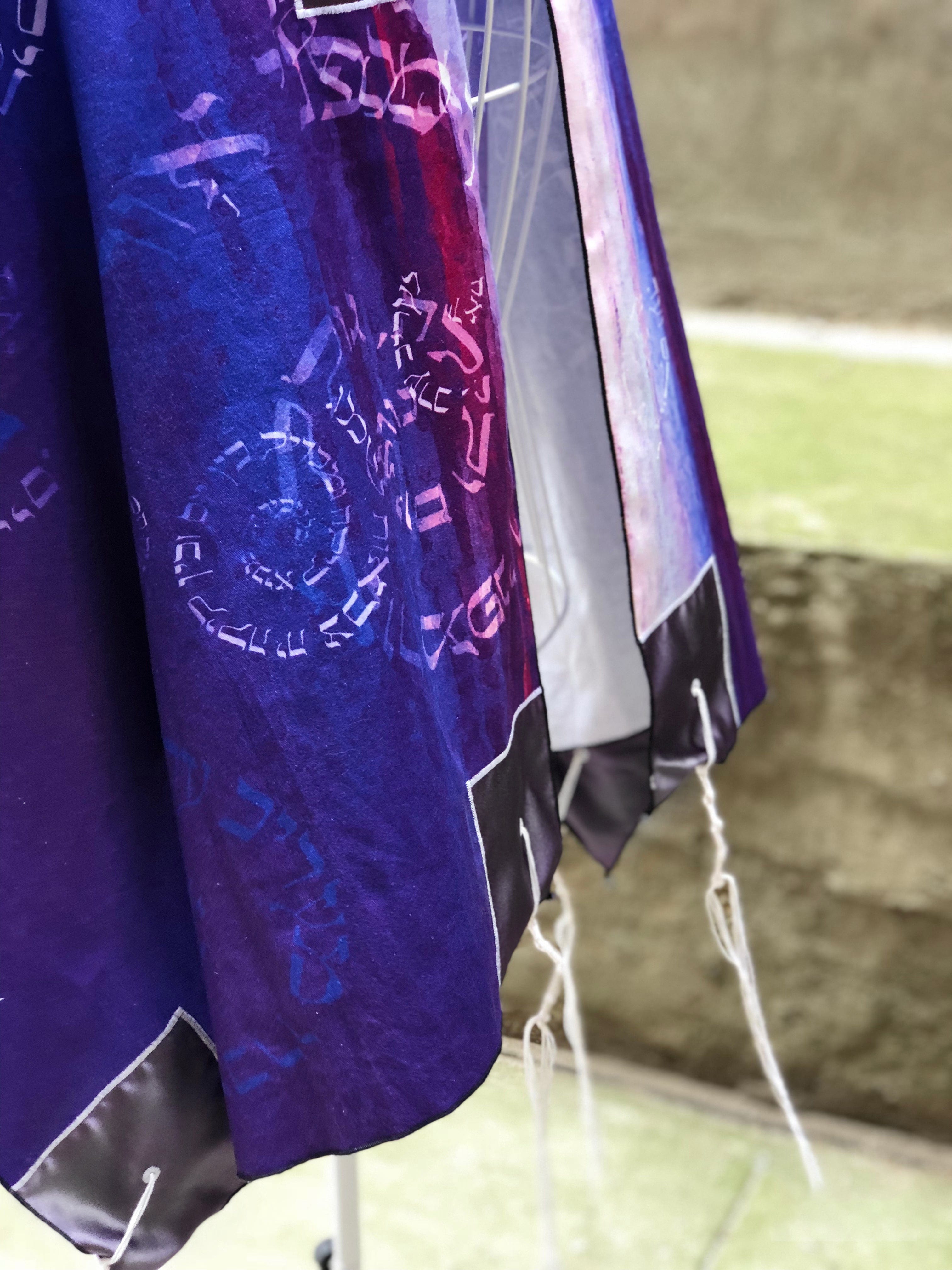 This tallit's design imagines the words of the first blessing before the evening Shema prayer as stars arranged in swirling designs that herald the entrance and exit of dusk and dawn.
